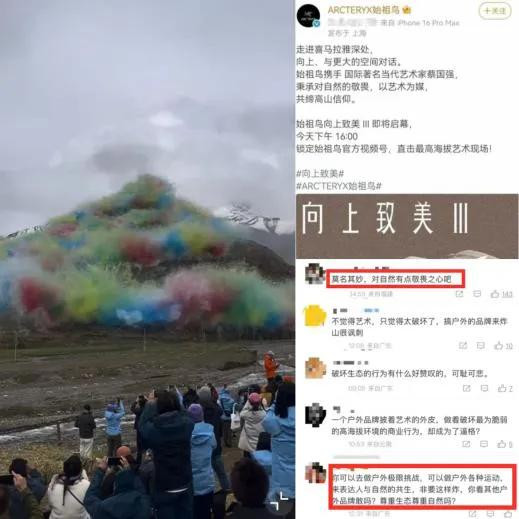 不少户外爱好者感叹,始祖鸟已逐渐偏离专业装备的初衷。随着资本与流量的涌入,价格水涨船高,而“中产三宝”“体制内标配”等标签更使其从功能服饰异化为社交符号。品牌口碑植根于产品,也可能消解于过度营销。例如此前“喜马拉雅山脉烟花秀”宣传引发的争议,便让部分消费者对品牌价值观产生质疑。